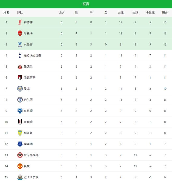 随着两场比赛落幕,英超积分榜也迎来最新变化:利物浦15分仍居首,但优势被阿森纳缩小到2分;大黑马水晶宫紧追其后;维拉则凭借首胜逃离降级区,升至第16位。