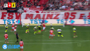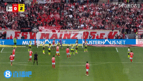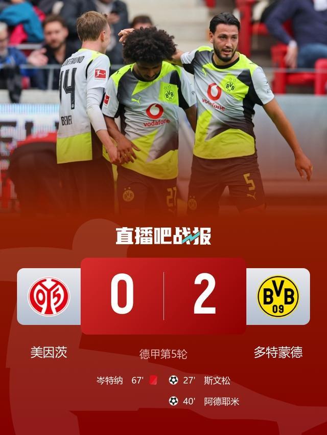 全场比赛结束,多特蒙德客场2-0战胜十人美因茨。