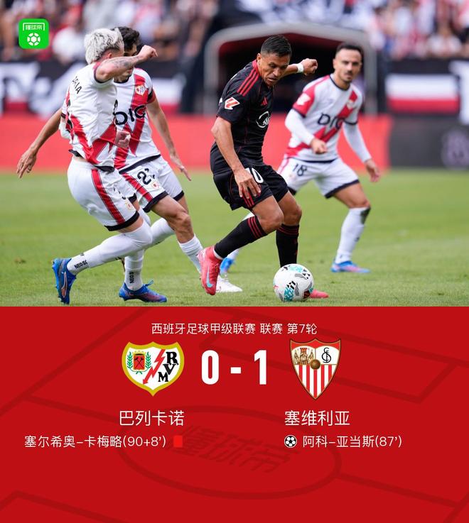 北京时间9月28日西班牙足球甲级联赛第7轮,巴列卡诺主场对阵塞维利亚。比赛末段,何塞-安赫尔助攻阿科-亚当斯破门,比赛最后时刻,卡梅略出言不逊染红。最终比分巴列卡诺0-1塞维利亚。