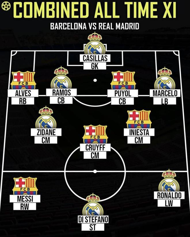 近日,一张“巴萨×皇马历史最佳11人”阵容图再次点燃话题:梅西与C罗同框,迪·斯蒂法诺坐镇中路,拉莫斯、普约尔镇守后场。