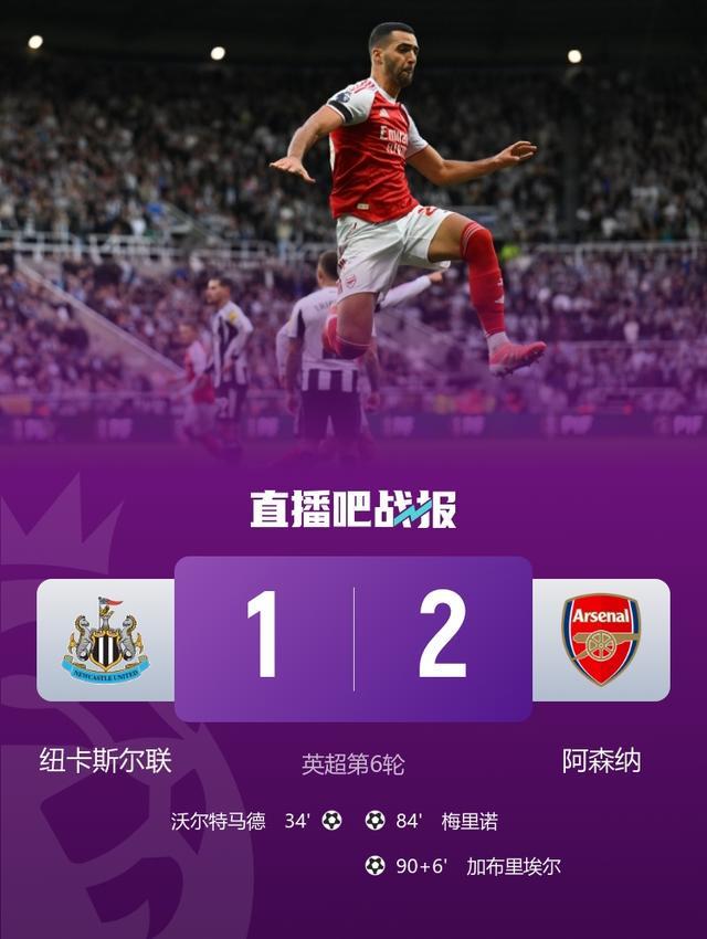 直播吧9月29日讯 北京时间23:30,英超第6轮纽卡斯尔联vs阿森纳,比赛在圣詹姆斯公园球场打响!上半场,约克雷斯禁区内倒地,主裁回看VAR后取消点球。波普两次扑出埃泽爆射;特罗萨德中柱;托纳利助攻沃尔特马德破门!下半场,梅里诺头球扳平比分!补时阶段加布里埃尔绝杀!最终,阿森纳2-1逆转纽卡,距离榜首2分。
