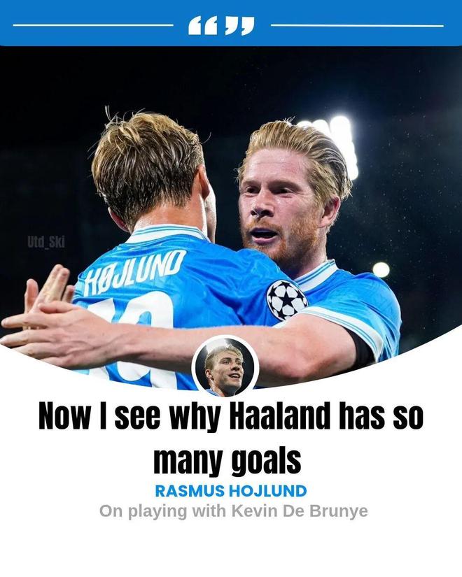 德布劳内谈霍伊伦:我觉得拉斯穆斯进步很大,他和哈兰德非常相似,两人都喜欢纵深冲击。